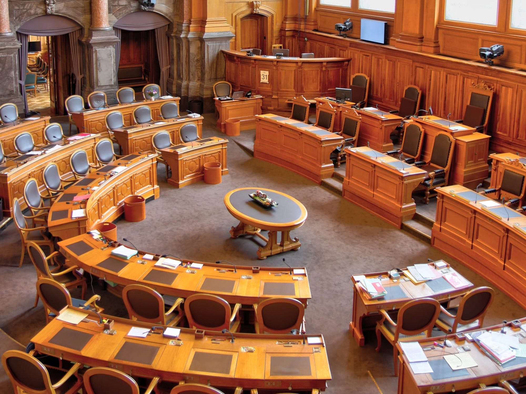 Wie du weisst, pflegt die Schweiz auf nationaler Ebene das Zweikammersystem. Wir sitzen auch in zwei verschiedenen Sälen. Kürzlich war ich vor der Session im Ständeratssaal auf Besuch und habe entdeckt, dass auf ihren Pulten Büroklammern und ein edler Brieföffner liegen.